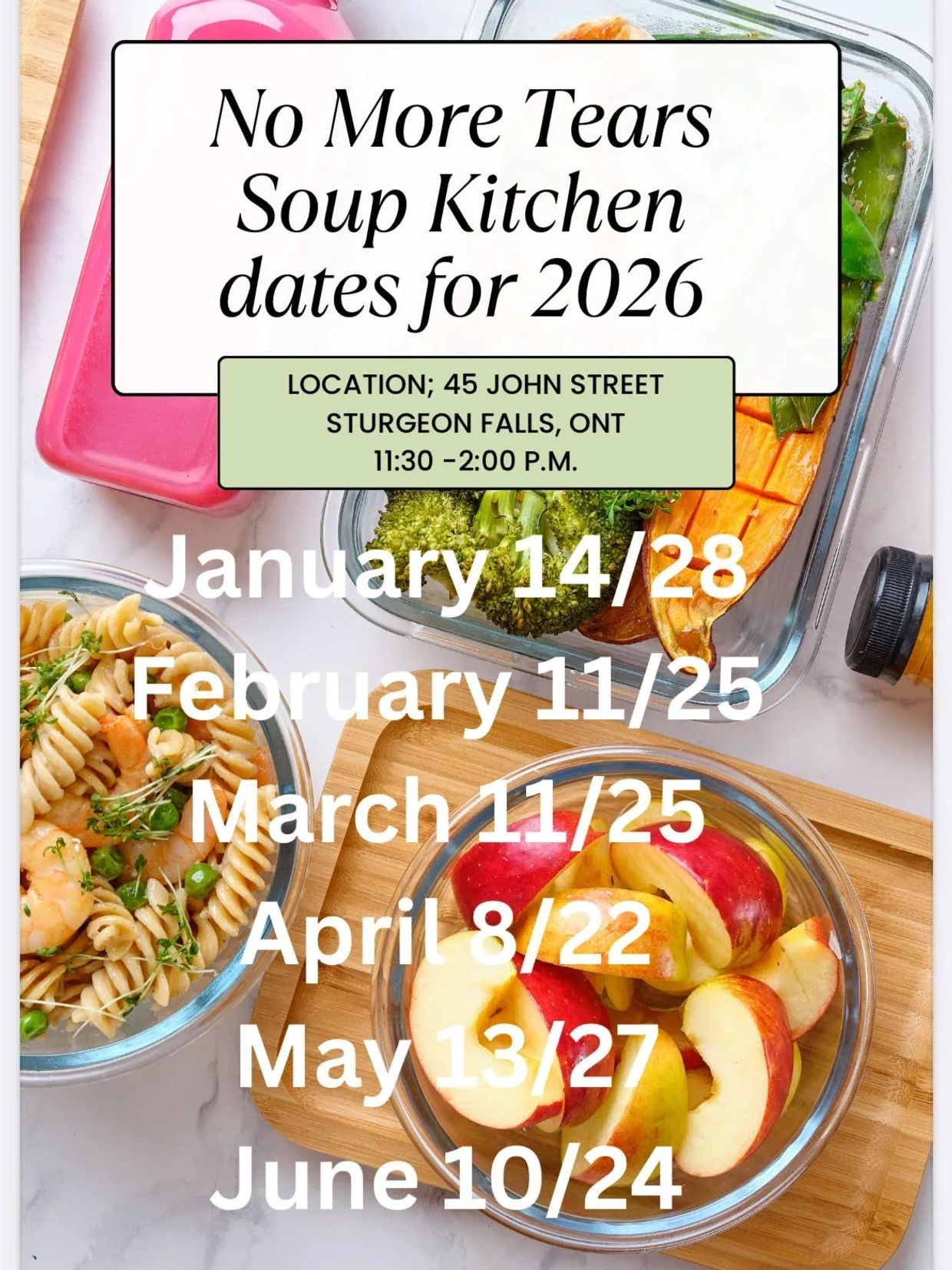 Come back regularly as we update our Soup Kitchen dates. We're happy to partner with Our Lady of Sorrorw's Church to provide a Soup Kitchen twice a month. 45 John St. Sturgeon Falls.